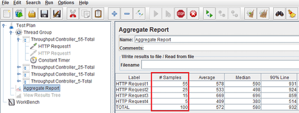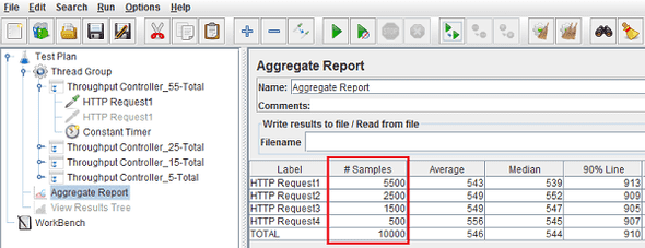 As you can see below, after execution of the Test Plan, the samplers have executed according to the frequency (throughput) set in each request.